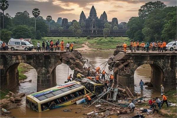 کمبوڈیا میں بڑا حادثہ: سیاحتی مقام سے آ رہی بس پل سے نیچے گری، 16 مسافروں کی موقع پر موت، کئی زخمی